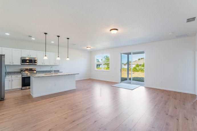 This 4 bedroom 2 bathroom Ruby Model is the perfect floor plan for any family - with nearly 1,700 sq ft of living space! As soon as you walk through the tall 8ft front door, you can appreciate the bright and open floor plan with high 9’4” ceilings. The home features beautiful wood-look, durable laminate flooring that flows seamlessly from the entryway into the spacious main living areas and kitchen. Designed for entertaining, the kitchen boasts a large center island, 36" white-wood cabinetry, sleek granite countertops, and a complete stainless steel appliance package, including a fridge. It’s perfect for hosting guests, with views of the rear lanai that extend the living space outdoors.